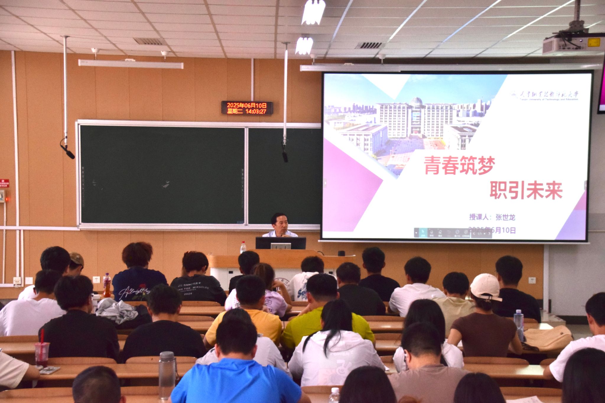 张世龙围绕“就业形势与对策”“个人成长经历与优秀员工风采”“对青年学子的殷切希望”三个方面展开,他剖析了当前严峻复杂的就业形势,针对公司专业特色及人才培养情况,从重塑观念、拓宽视野,强化能力、提升内核,优化策略、精准匹配,关注热点、抢占先机,把握秋招、积极准备等五个方面为员工就业规划提出关键对策;讲述了自己四十余年扎根职业教育,从技校生成长为高校正高级职称教师和正处级管理干部的奋斗历程,为在场员工树立了示范榜样;分享了徐国胜、李基伍、戴琨、翟津等多名优秀员工事迹,激励在场学子以优秀员工为标杆,传承工匠精神,不断追求卓越。张世龙向全体青年学子提出殷切希望,要牢记总书记嘱托,做有理想、敢担当、能吃苦、肯奋斗的新时代好青年,要深刻认识职业教育在国家现代化建设中的广阔前景,在校期间刻苦钻研,练就真才实学和精湛技能,用青春担当为实现中华民族伟大复兴贡献力量。
