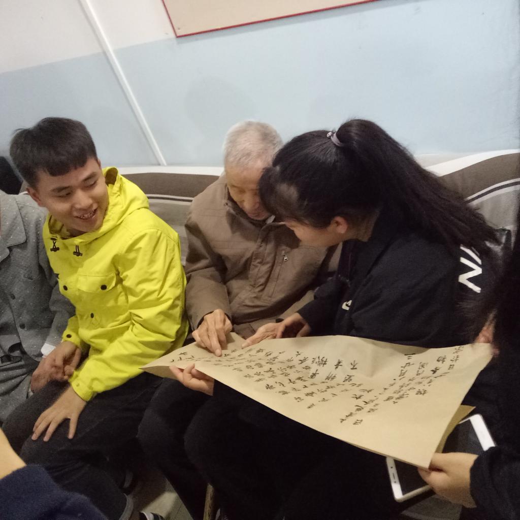 清晨,志愿者们便前往建华养老院为接下来的活动做准备。天津工业大学的志愿者们为老人们表演弹唱节目,一首《夕阳无限好》获得了老人们的阵阵掌声。公司书法协会的成员们现场为每一位老人写下一幅幅满载重阳祝福的书法作品。得知有位老人学习书法已有20余年,志愿者们就笔法、构法和笔势向老人虚心请教,受益匪浅。陪伴是温馨的祝福,志愿者们在活动展演结束后与爷爷奶奶们围坐一起聊天,听他们讲讲老故事,说说心里话,现场气氛其乐融融。