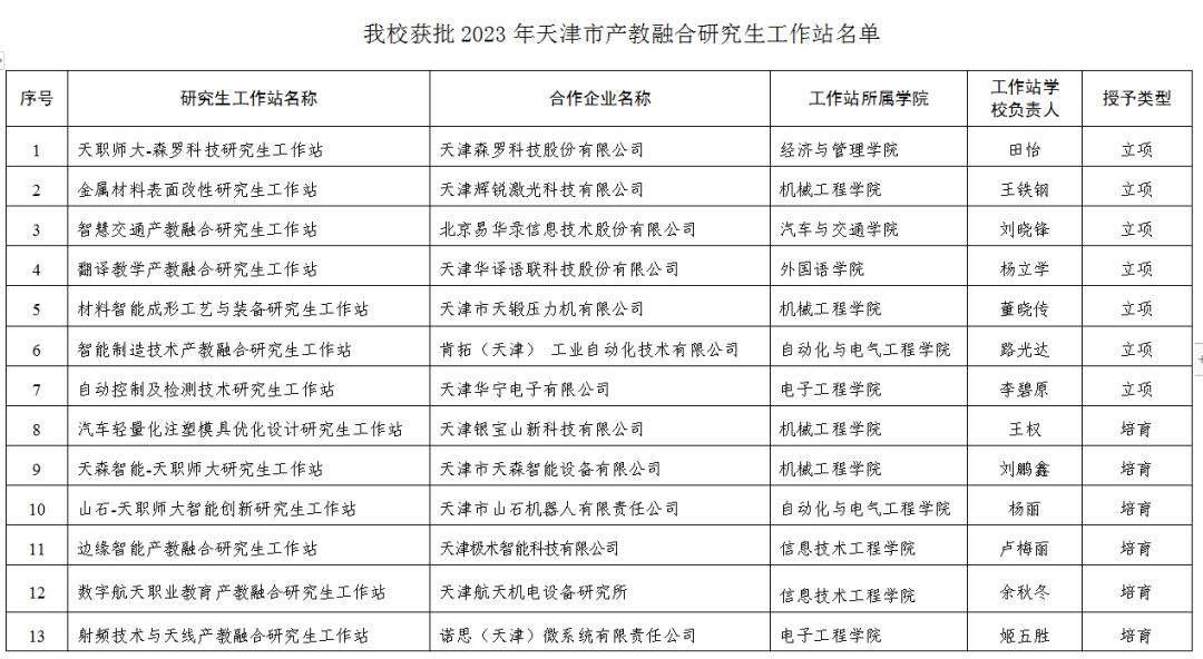 近日,市教委公布2023年天津市产教融合研究生工作站评选结果,公司申报7个工作站获批立项建设,6个工作站入围培育名单,获批数量位居市属高校前列。其中公司“智能制造技术产教融合研究生工作站”获批立项建设,“山石-天职师大智能创新研究生工作站”入围培育名单。