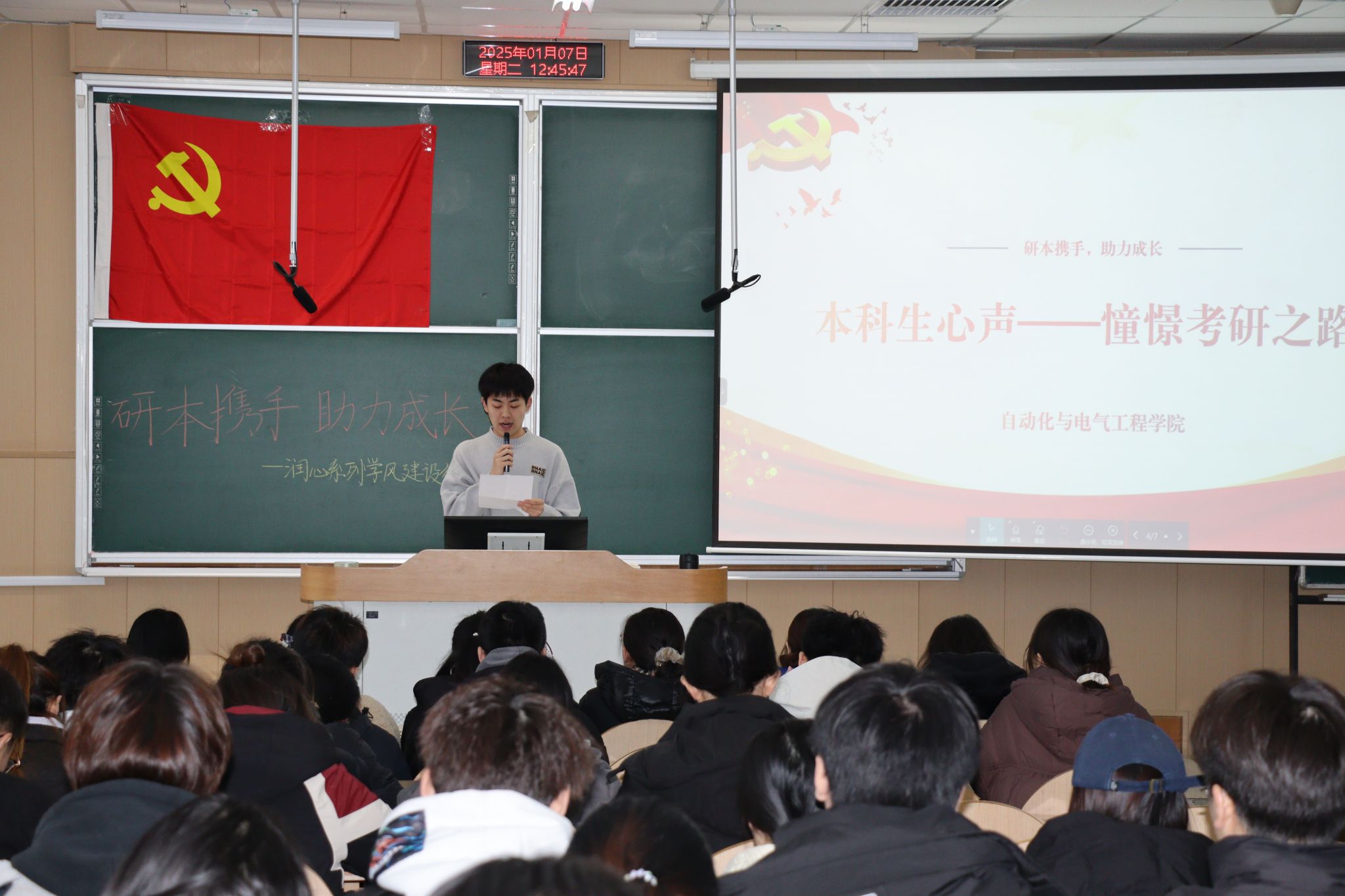 研究生代表朱彦洁倾囊相授,带来干货满满的经验分享。院校抉择层面,她强调要运用大数据思维,结合自身优势与院校特色,多维度参考师长建议,精准匹配理想院校;复习策略层面,针对不同学科特性,提供高屋建瓴的宏观指导,从知识梳理到时间管理,为学弟学妹们勾勒清晰备考蓝图;心态调整层面,鼓励同学们正视焦虑情绪,以研友为伴、携手奋进,确保备考之路高效且稳健。本科生代表孙昊然以真挚的话语抒发对考研的坚定决心。并表达了对于前辈与师长能够帮扶引领的感谢,希望能够在学长学姐支持帮助下克服考研路上的重重困难,书写自己的青春篇章。