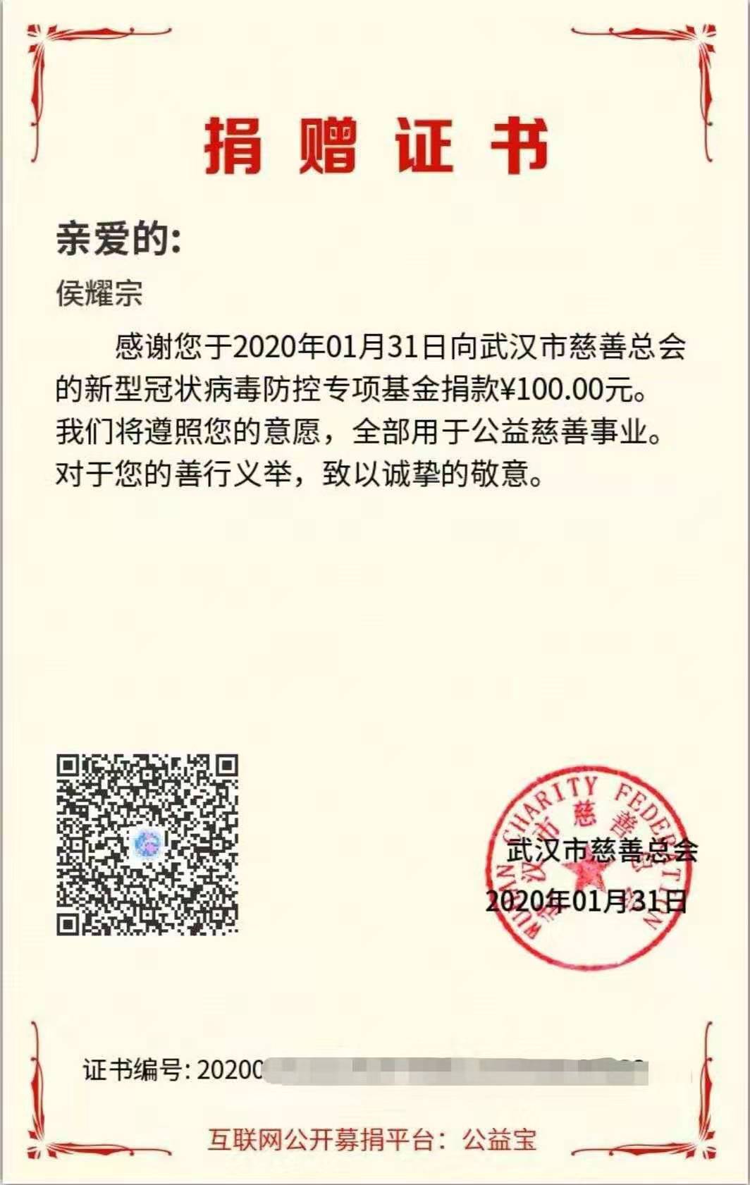 侯耀宗,电自测控党支部党员、电自1602班班长。疫情发生后,侯耀宗通过网络平台向武汉市慈善总会捐款100元。侯耀宗是公司特殊困难员工。但他刻苦努力、积极乐观。当问到为什么会捐款的时候,他直言:“我一直在关注疫情,看到网上的捐款渠道,就捐了点钱,钱也不多。而且我是名党员,该贡献的时候就要贡献。”